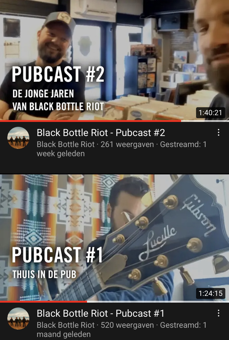 Black Bottle Riot will host a monthly live pubcast on youtube and we’d be delighted if you’ll join us! Just like we’re in the pub together. We aim at a stream of -say- 75 minutes, during which we’ll share some stuff with you from back in the day or new and fresh stuff. There’ll be some live music (and you might be surprised, but we’ll do some songs in Dutch too! Because: why not?), some insights in our gear and we’ll visit some cool places you might enjoy as well. How about Mark visiting a tattooshop (and getting some ink of course), Jaap showing the workspot where our leather guitar straps were made by hand and Mike doing some crate digging at a wonderful local vinyl shop? Mainly we go for that pub vibe, just hanging and chatting a bit – and we love to see YOU posting some feedback, questions or insights in the live chat! Get in touch!